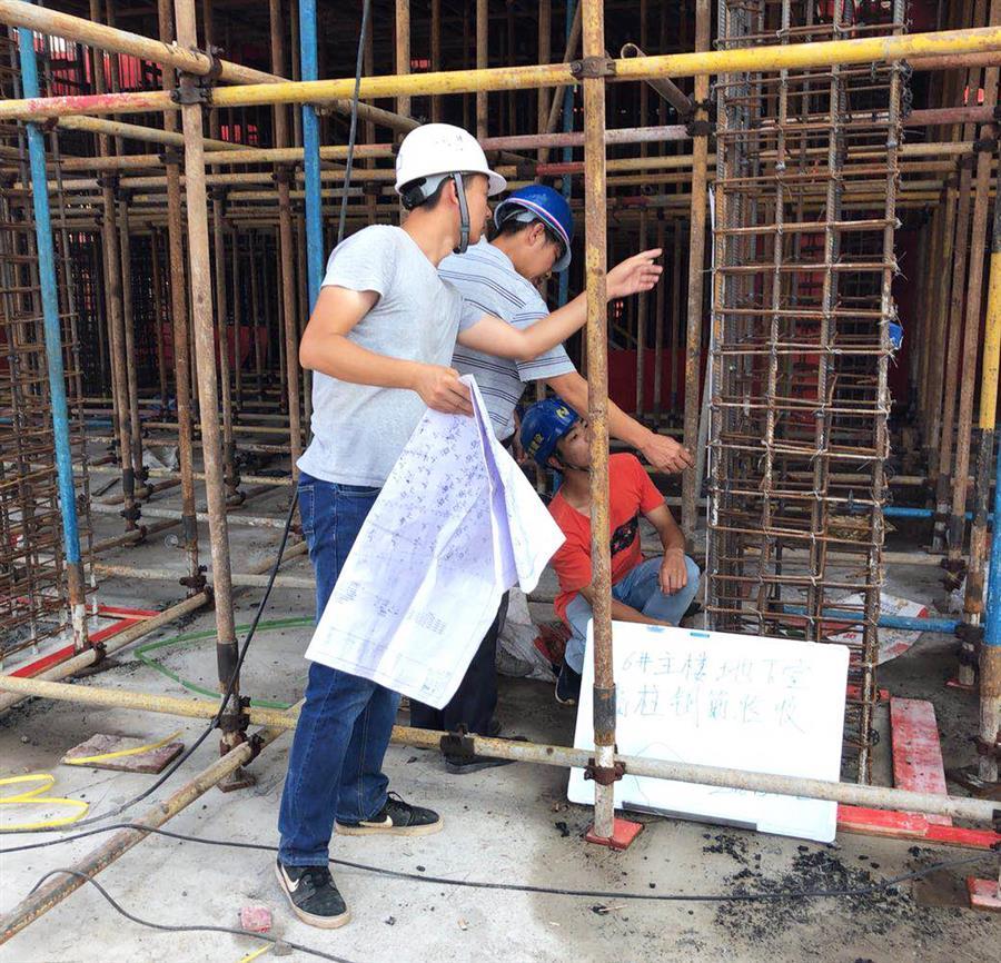 6月18日,在桂華分公司承建的梧州佛子時代廣場項目現(xiàn)場,當空烈日讓偌大的工地一片熾熱,焊花飛濺,工程車來來往往,工人們揮汗如雨。雖然施工作業(yè)已經(jīng)避開了高溫時段,但工人們?nèi)员缓顾粤搜劬?,濕了衣服。盡管這樣,大家仍堅持“全副武裝”,手套、防護用具,安全帽,一樣都沒有少,自覺遵守安全文明施工相關規(guī)范。入行兩年的施工員趙俊財抹了一把汗說道:“剛參加工作時,不能和家人一起過節(jié)還挺難受的,后來把心態(tài)調(diào)整好了,想著只要家人安好,其實比什么都重要,趁著年輕,還是應該多奮斗?!笨粗幻装舜髠€的他手拿圖紙和卷尺,蜷縮著身子,蹲在空間有限且熱得發(fā)燙的平臺上仔細檢查剛剛綁扎好的鋼筋籠,驕陽烤得他黝黑的皮膚泛出一層水光,襯著那還略顯年輕的臉龐,顯得熠熠生輝。