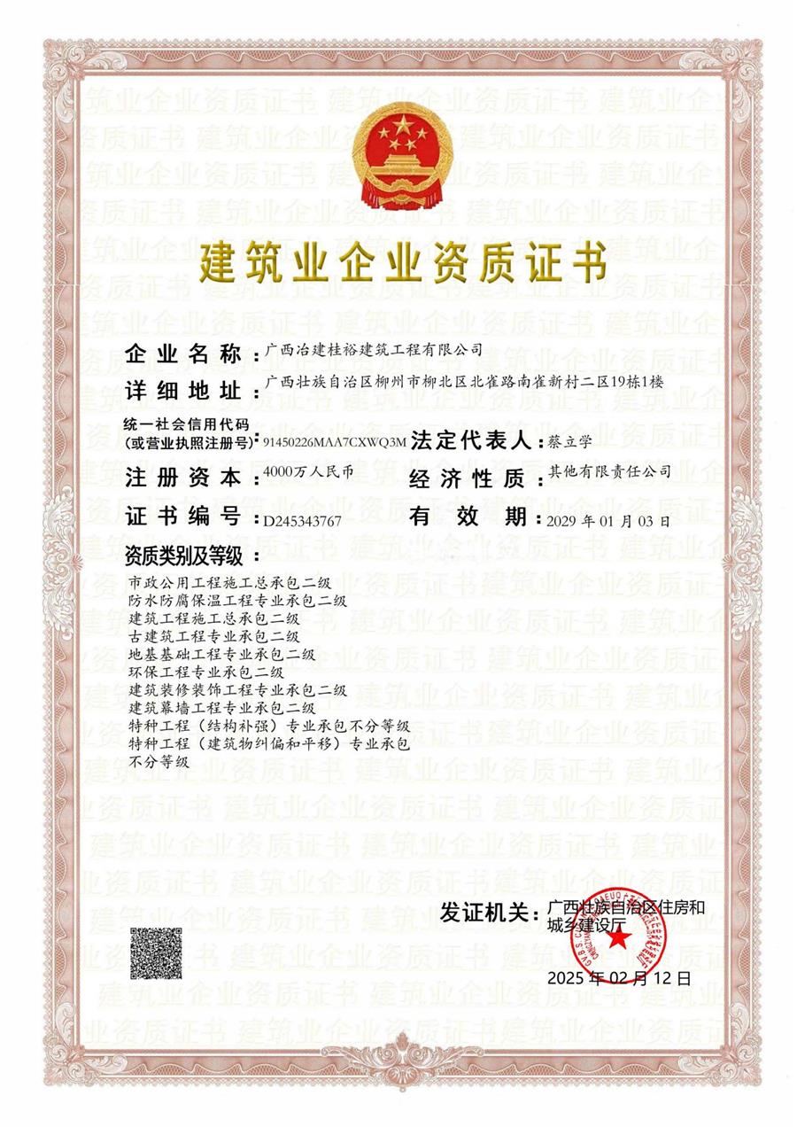 這8項專業(yè)承包資質(zhì)分別是:防水防腐保溫工程、古建筑工程、地基基礎(chǔ)工程、環(huán)保工程、建筑裝修裝飾工程、建筑幕墻工程、特種工程(結(jié)構(gòu)補強)、特種工程(建筑物糾偏和平移)專業(yè)承包資質(zhì)。此批資質(zhì)將為桂裕公司后續(xù)的業(yè)務(wù)承攬、拓展區(qū)域市場提供有力保障,為冶建公司高質(zhì)量發(fā)展添磚加瓦。