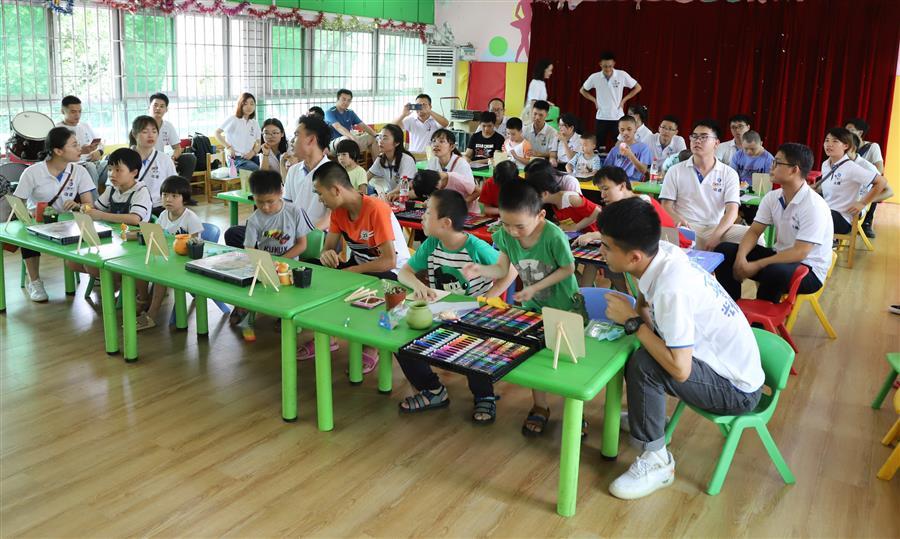 活動當(dāng)天,參加活動的青年志愿者在福利院工作人員的帶領(lǐng)下參觀了福利院的教室、寢室、廚房、餐廳以及舞蹈室等孩子們的生活、學(xué)習(xí)場所,詳細(xì)了解了孩子們的身體健康、學(xué)習(xí)生活等情況。隨后,青年志愿者們和福利院孩子們一起圍成“同心圓”,伴隨著歡快的音樂聲,青年志愿者們和孩子們一起玩起了“擊鼓傳球”、“你畫我猜”、“蒙眼過障礙物”等游戲。在游戲過程中,每一個孩子都融入到了互動環(huán)節(jié)中,現(xiàn)場氣氛融洽。青年志愿者還與孩子們一起種植綠植,在老師的講解下,大家順利的完成了一件又一件的綠植作品。