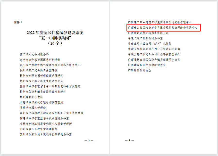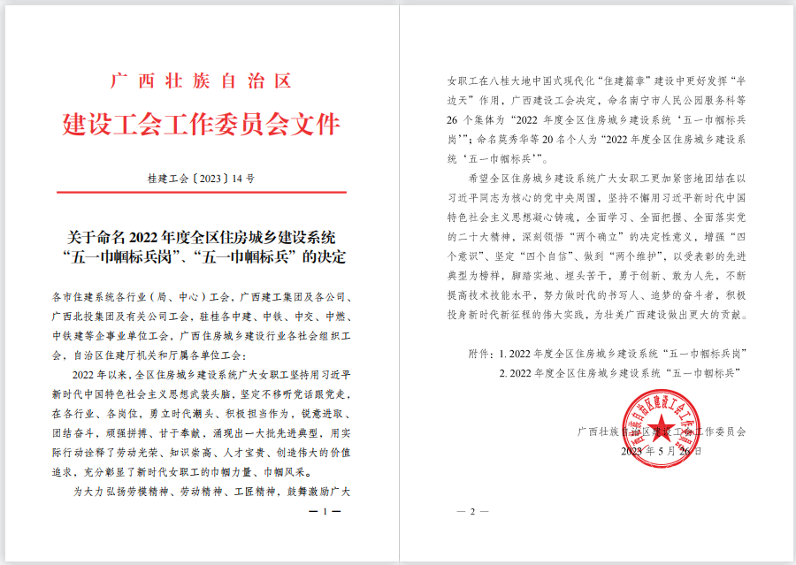 近日,廣西建設(shè)工會(huì)工作委員會(huì)下發(fā)了《關(guān)于命名2022年度全區(qū)住房城鄉(xiāng)建設(shè)系統(tǒng)“五一巾幗標(biāo)兵崗”“五一巾幗標(biāo)兵”的決定》,冶建經(jīng)營(yíng)公司造價(jià)咨詢中心榮獲“五一巾幗標(biāo)兵崗”稱號(hào)。